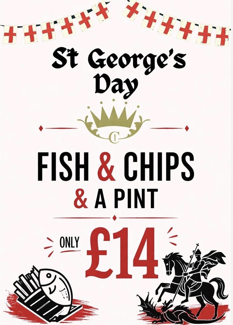 Celebrate St George defeating the dragon with a fish and chip supper at The Crown for just £14. Book a table on 01223 891 759 or email info@crownatlinton.co.uk